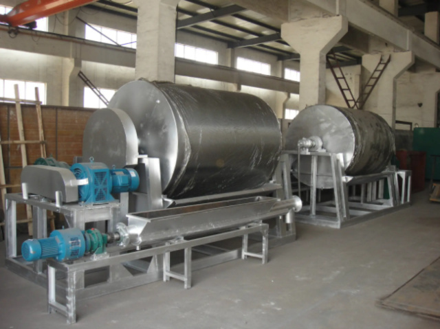滾動刮板干燥機(jī)由主滾筒、機(jī)架、加料裝置(上部加料或下部浸料)、驅(qū)動機(jī)構(gòu)、螺旋送料裝置、吸塵裝置、刮刀裝置等部件組成。